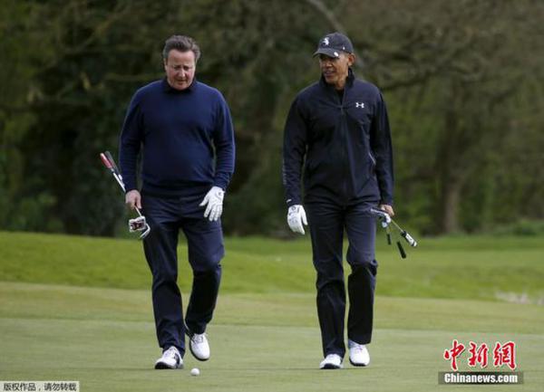 北京时间2016年4月24日,周六,美国总统奥巴马和英国首相戴维-卡梅伦在一家位于伦敦北部的高级球场一起打球,这也是他海外繁忙之旅中安排的最喜欢的周末休闲时光。
