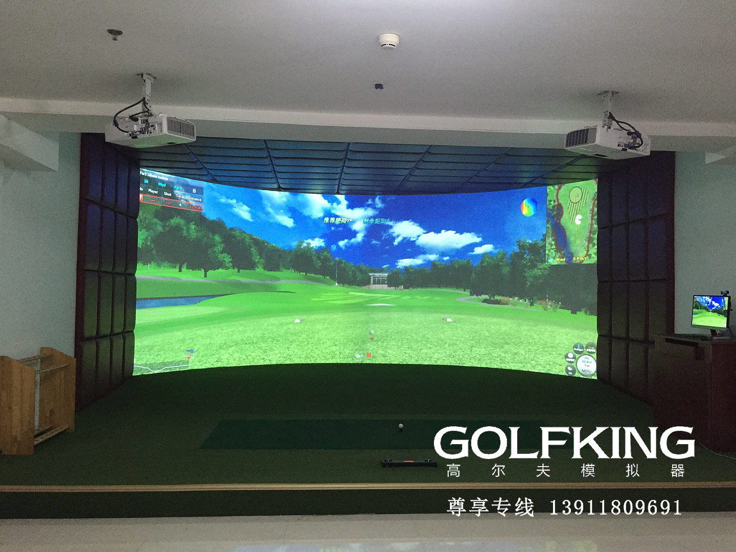模拟高尔夫设备是一门新式的康体项目, 其间主要特征是把室外的高尔夫运动引进到室内,三维虚拟的方法在大屏幕上生成虚拟的三维高尔夫球场,在大屏幕的前方使用者用实在的高尔夫球杆对着大屏幕击打实在的高尔夫球,在高尔夫球被击打今后的一会儿经过高尔夫丈量体系测出球飞翔的各种参数,电脑剖析这些参数,然后在虚拟的高尔夫球场里来模仿高尔夫球的飞翔轨道,达到在实在的球场里打球的作用。