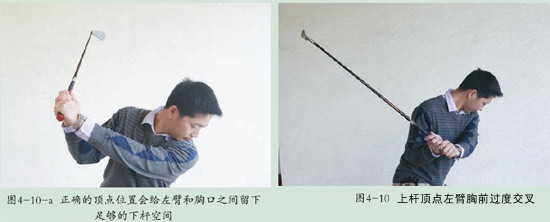 导致上杆顶点左臂胸前过度交叉的主要原因是,上杆动作不是由肩部主动旋转来完成,而是由手臂主动上举球杆来完成。为了获得理想的上杆位置,左臂必然在胸前过度交叉。
